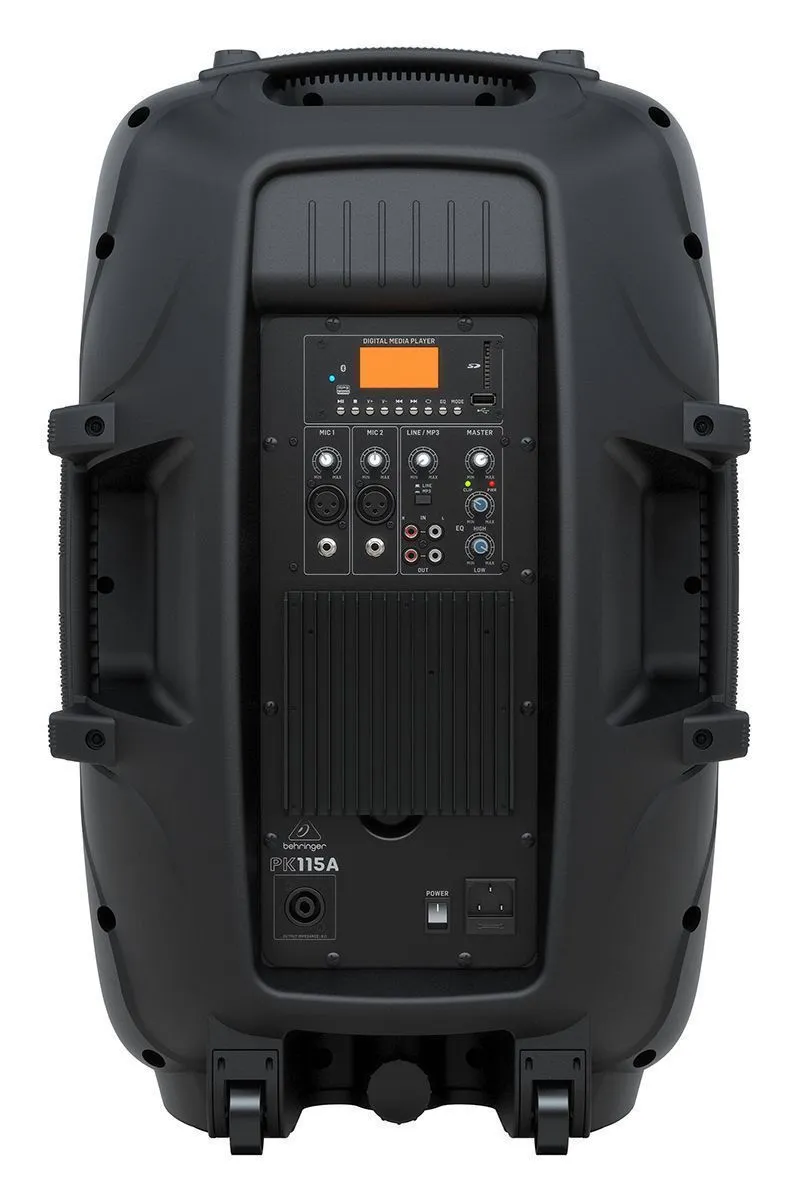 Behringer PK115A - ультракомпактная, двухполосная, активная акустическая система, с 15 ' НЧ вуфером с увеличенным ходом звуковой катушки и 1' компрессионным ВЧ твитером. На задней панели встроенный медиаплеер с дисплеем, слотом для SD-карты, USB-портом и приемником Bluetooth. 2-х канальный микшер с отдельными микрофонными / линейными входами, регуляторами громкости и светодиодами перегрузки.2-х полосный эквалайзер и встроенный DSP для максимального контроля и защиты динамиков от перегрузки. Сверхширокая дисперсия, широкоформатный экспоненциальный рупор. Линейный выход на задней панели усилителя позволяет подключать дополнительные акустические системы.