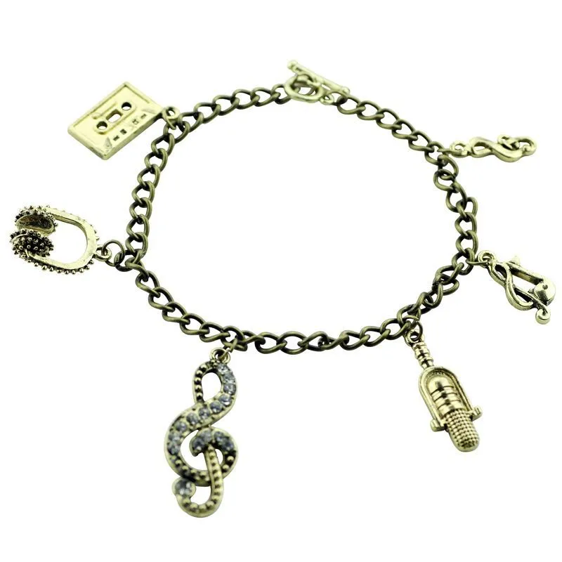 Браслет с подвесками. Наушники, кассета, скрипичный ключ.