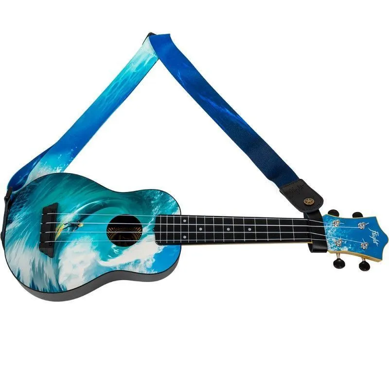 Стильный ремень для укулеле Flight Surf с морским рисунком, перекликающимся с рисунком укулеле Flight TUS 25 Surf.