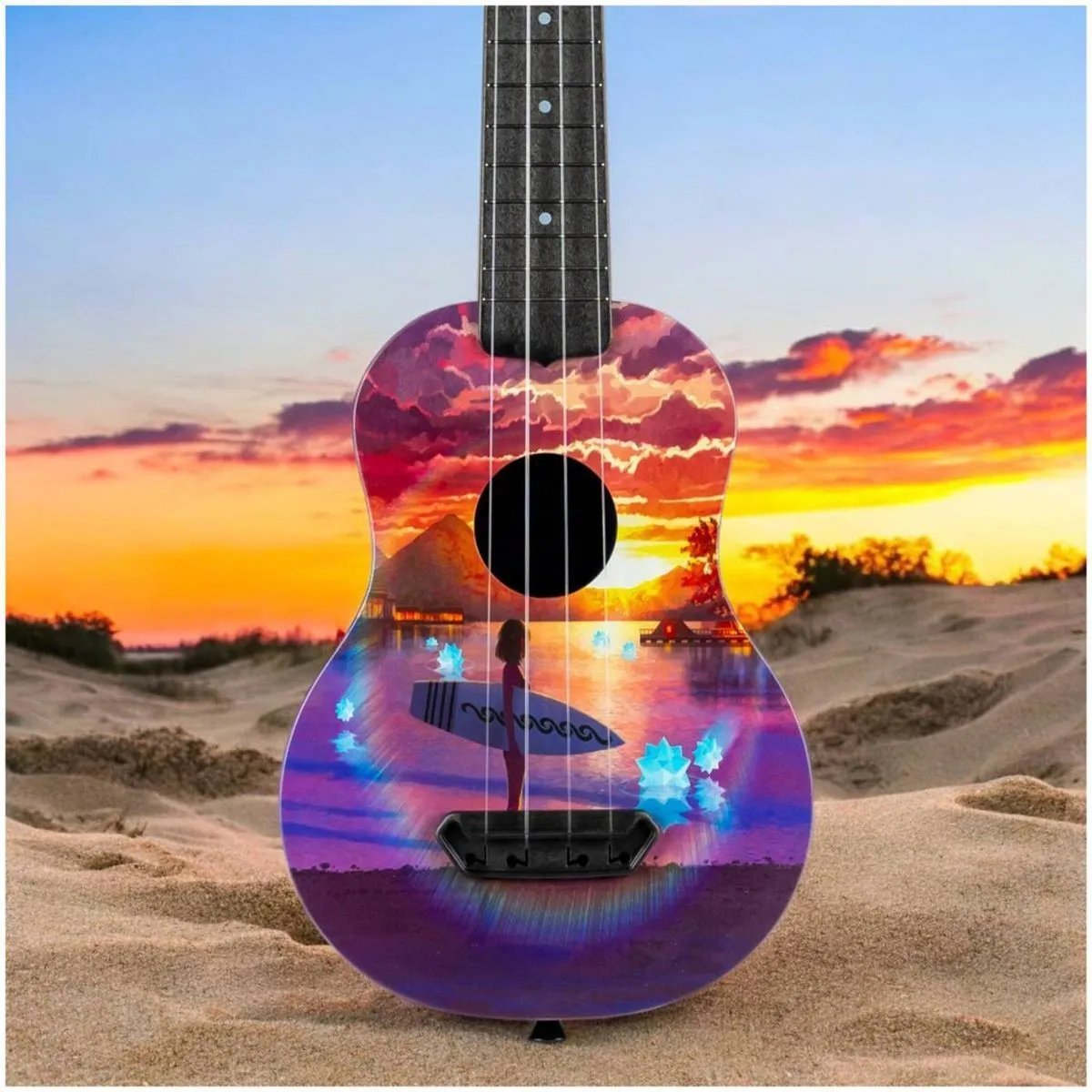 Объемное и яркое звучание инструмента достигается за счет особой полукруглой формы корпуса и звонких флюрокарбоновых струн, которые обычно стоят на более дорогих, премиальных укулеле.