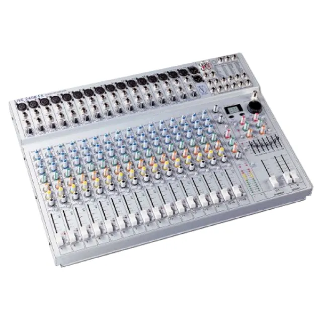 Микшер Live 2408 FX имеет 16 монофонических микрофонных/линейных каналов и два стереофонических линейных. Каждый моноканал имеет вход на XLR, разрыв, регулятор чувствительности, резонансный пропускающий фильтр высоких частот (80 Гц), трехполосный эквалайзер (16 кГц, 1,8 кГц, 80 Гц), два посыла на внешнюю обработку, переключатель посыла до/после фейдера, посыл на встроенный процессор эффектов, регулятор панорамы, кнопку заглушения (она же — назначения на альтернативную стереошину), кнопку солирования (PFL), фейдер уровня, светодиодные индикаторы наличия сигнала, пикового уровня и фантомного питания (48 В).